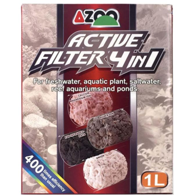 AZOO 4 in 1 Active Filter es un medio filtrante químico específico y de alto rendimiento, con una tasa de descomposición y superficie efectivas que superan en 400 veces a otros materiales filtrantes tradicionales. Combina de forma sinérgica los cuatro compuestos de la línea Active Filter: Far Infrared, Silver Ion, Calcium & Magnesium Ion y Anion Active Filter. Está elaborado mediante una nueva tecnología de sinterización a altas temperaturas, logrando una baja gravedad específica, una porosidad máxima, excelentes propiedades hidrofílicas (HRT) y un bajo peso unitario. Favorece la renovación de la colonia bacteriana, mejorando el metabolismo de las bacterias benéficas. Este producto es reciclable como sustrato para plantas.