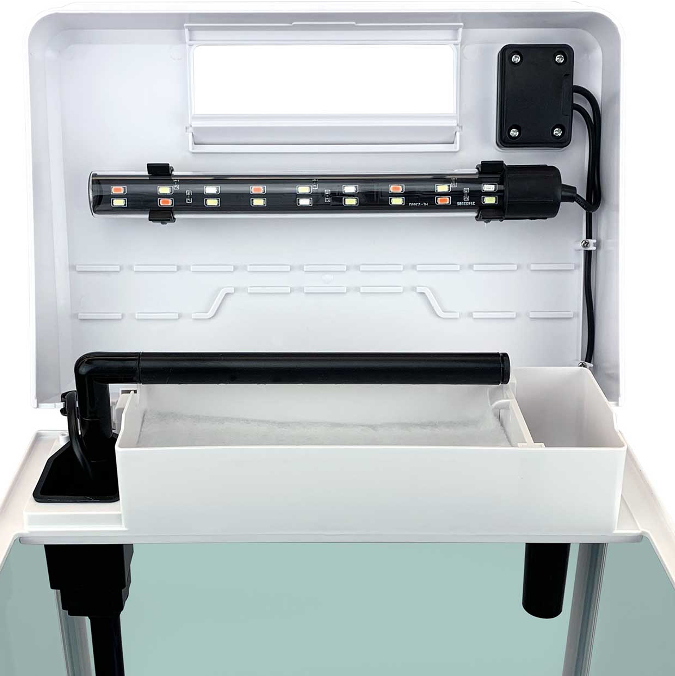 La luminaria de los Acuarios BOYU Serie MS está dotada de eficientes chips LED de hasta tres colores (azul, blanco y rojo), que se controlan mediante un control táctil integrado en la cubierta.