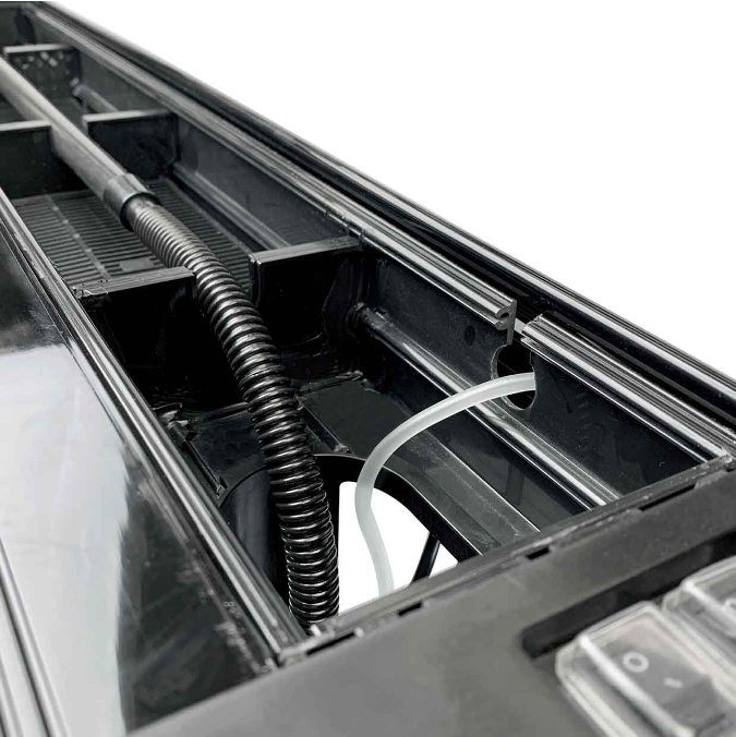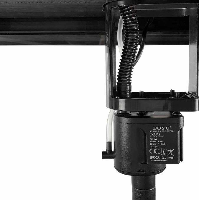 Los Acuarios BOYU Serie ZDT vienen equipados con un filtro superior oculto bajo la tapa y apoyado sobre sus refuerzos superiores y movido por una potente bomba.