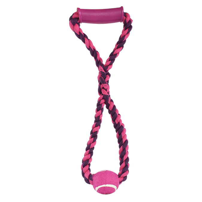 Aro de hilo de algodón multicolor, con pelota tipo tenis, trenzado en la parte media y con agarradera de plástico. Fabricado de algodón que ejercita la mandíbula, fortalece las encías, limpia los dientes y entretiene a la mascota. Tiene agarradera de plástico que le permite interactuar con el perro, previniendo el estrés y el problema de mordisquear.