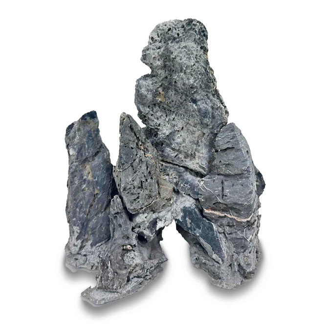Los “Arreglos rocosos tipo montañas” presentan una variación de grises que aportan profundidad y contraste, lo que las hace ideales para combinar con plantas acuáticas de tonos verdes. Las superficies fracturadas y las líneas angulosas de estas rocas evocan la fuerza de la naturaleza, como si hubieran sido esculpidas por el paso del tiempo, ofreciendo una estética visual que invita a la contemplación.
