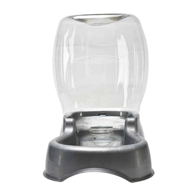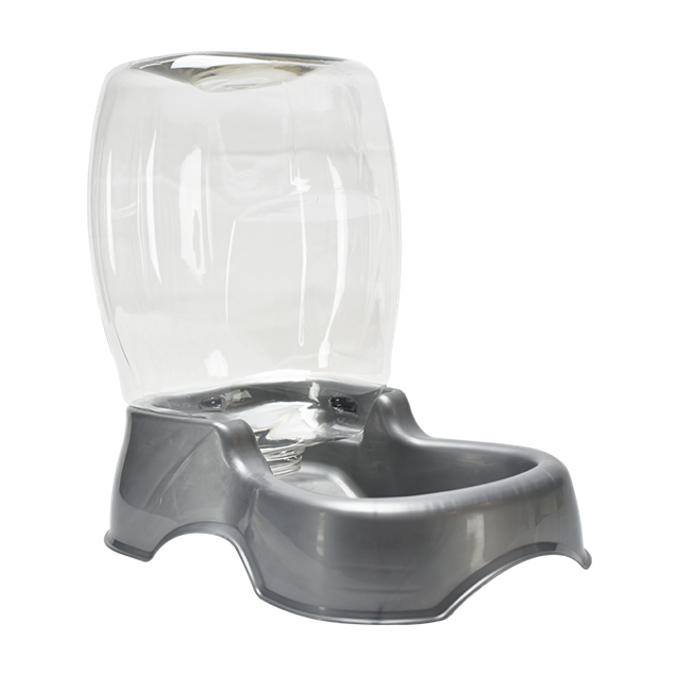 Bebedero dispensador de agua por gravedad, el orificio para serviri es de tamaño adecuado para permitir el paso de agua dependiendo del consumo de la mascota, al mismo tiempoq ue es adecuado para una limpieza completa y adecuada. Base con diseño que facilita la maniobra de levante.