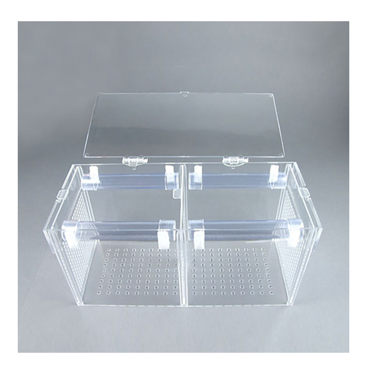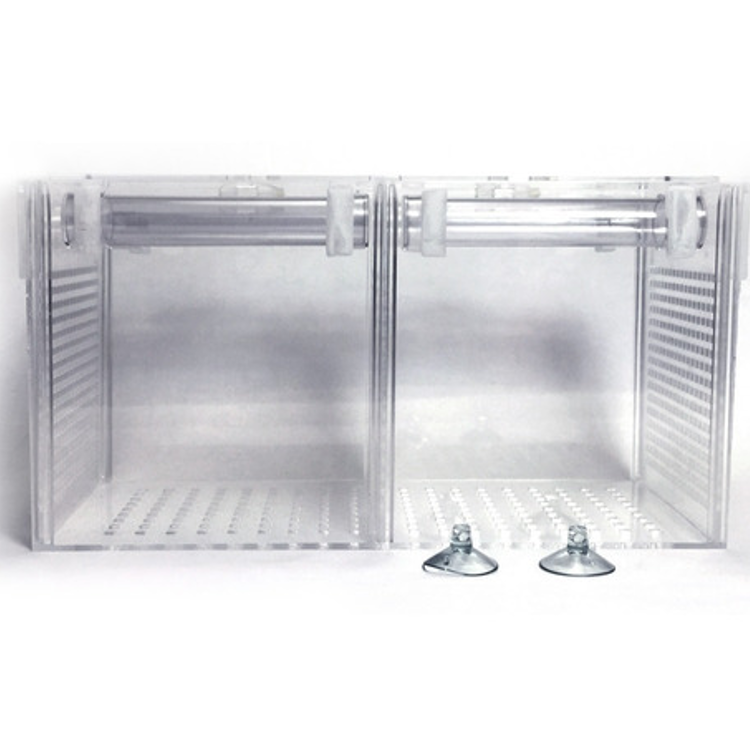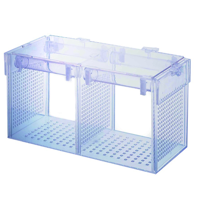 Acuario flotante para aislamiento de especies de pequeñas y grandes dimensiones, construido en plástico transparente de alta resistencia. Cuenta con dos ventosas para una correcta fijación y cuatro cavidades de aire que aseguran una flotabilidad positiva en cualquier circunstancia, evitando de forma definitiva un hundimiento accidental. Posee tres separadores perforados dispuestos de tal forma que permiten realizar múltiples funciones minimizando el estrés en los peces. Gracias a estas piezas removibles puede introducir, liberar o separar fácilmente los ejemplares en una o dos cavidades y sin sacar el acuario del agua. La perfecta transparencia de sus paredes y tapa ofrece una observación inmejorable de los peces o invertebrados aislados, mientras que las perforaciones en separadores y fondo permiten una correcta circulación de agua al tiempo que evitan la acumulación de desechos orgánicos en el fondo.