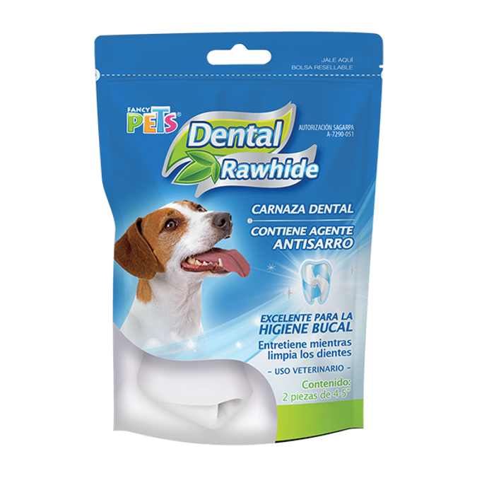 La carnaza dental (10-13 CM) contiene hexametafosfato de sodio, agente antisarro que actúa como quelante del calcio presente en la saliva. La administración contante de este producto contribuye a la reducción del sarro denta, previene enfermedades bucales y ayuda con el control del mal aliento.