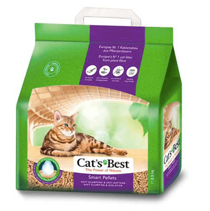 El Cat´s Best Smart Pellet es la arena vegetal y aglomerante que pone fin a la dispersión de granulos fuera de la bandeja. La forma especial de los gránulos reduce la adherencia al pelaje de las patas, lo que elimina la arena que se sale del arenero. Los Cat´s Best Smart pellets también utilizan la capacidad de las fibras de madera activas refinadas tecnológicamente, que absorben eficazmente la orina, los líquidos y los olores y los encapsulan en el interior, hasta 7 veces su propio peso. Por lo tanto, Cat’s Best Smart Pellets puede permanecer en la caja de arena hasta 3 semanas antes de que sea necesario un cambio completo.