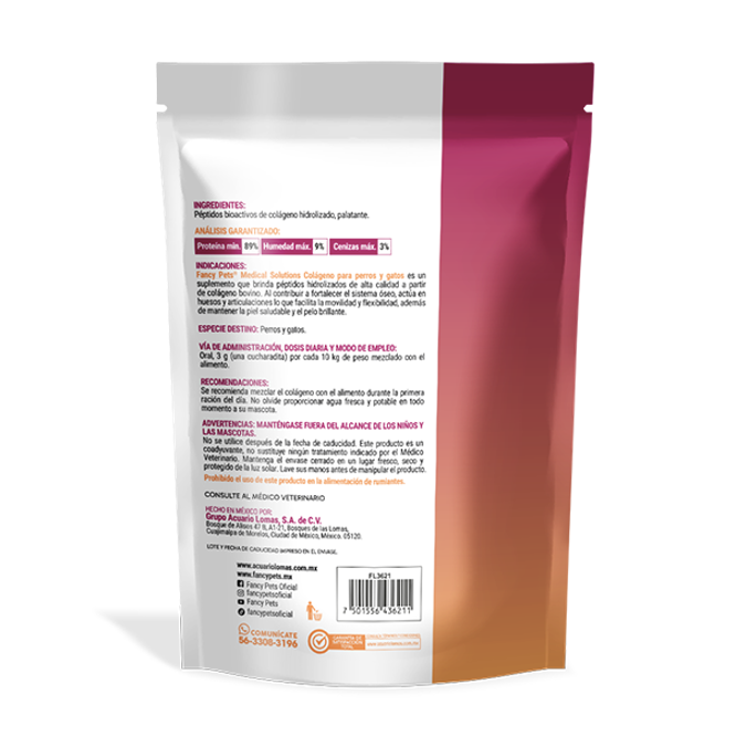 Colágeno Medical Solutions para perros y gatos es un suplemento que brinda péptidos hidrolizados de alta calidad a partir de colágeno bovino. Al contribuir a fortalecer el sistema óseo, actúa en huesos y articulaciones lo que facilita la movilidad y flexibilidad, además de mantener la piel saludable y el pelo brillante.