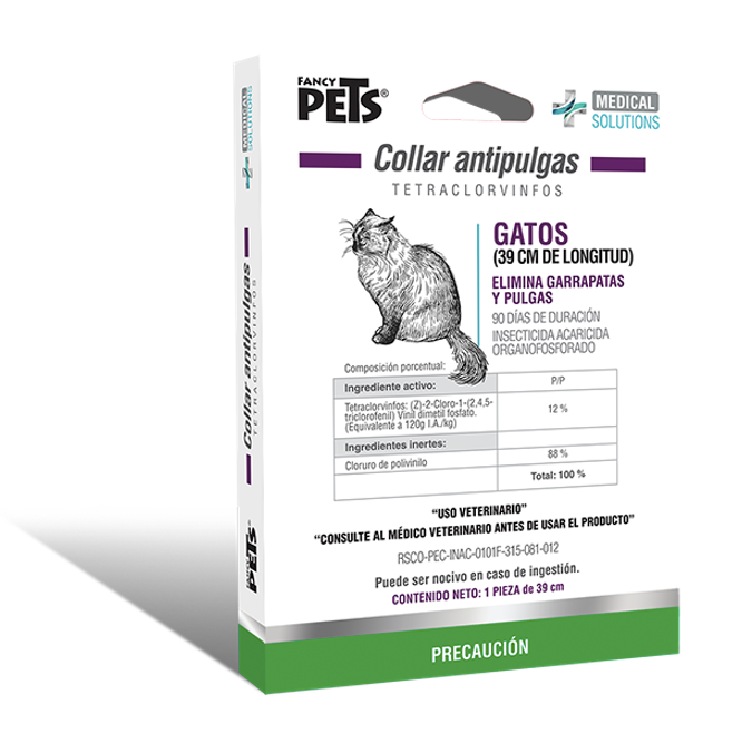 Collar antipulgas para gato Medical Solutions es un acaricida eficaz contra pulgas y garrapatas. Su mecanismo de acción actúa como paralizador del parásito, provocando su muerte y previniendo la reinfestación. Es resistente al agua y repele a los ectoparásitos hasta por 90 días.