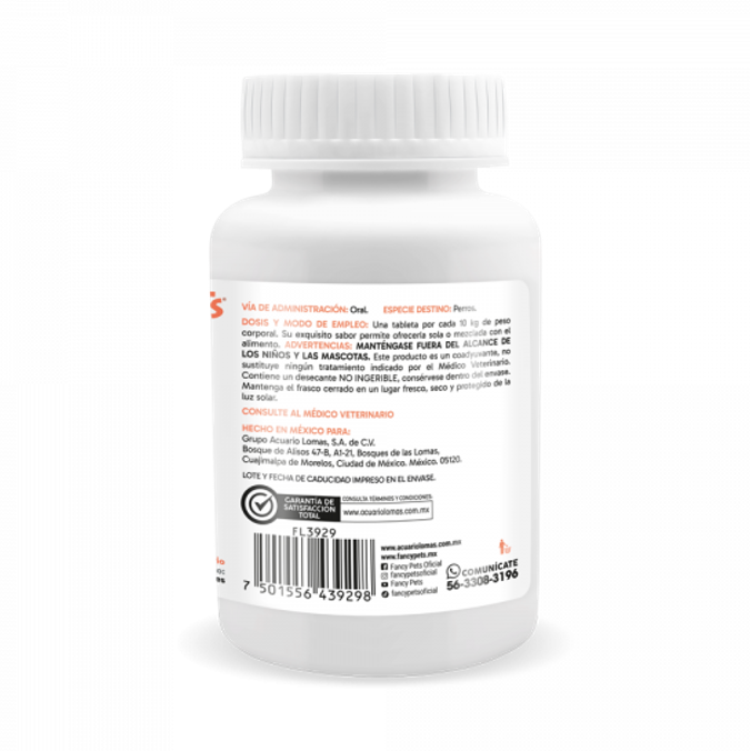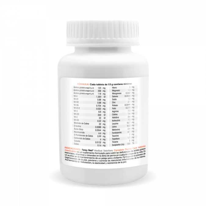Tabletas Masticables Complete Derma Care es un suplemento formulado para cubrir las deficiencias de ácidos grasos esenciales, vitaminas y minerales en la dieta de perros en cualquier etapa de su vida. Es un auxiliar en el mantenimiento de un pelaje sano y brillante. Participa en el proceso de regeneración de la piel, previene y controla las reacciones inflamatorias de la misma. Aumentando la hidratación, la elasticidad y resistencia de la piel.
