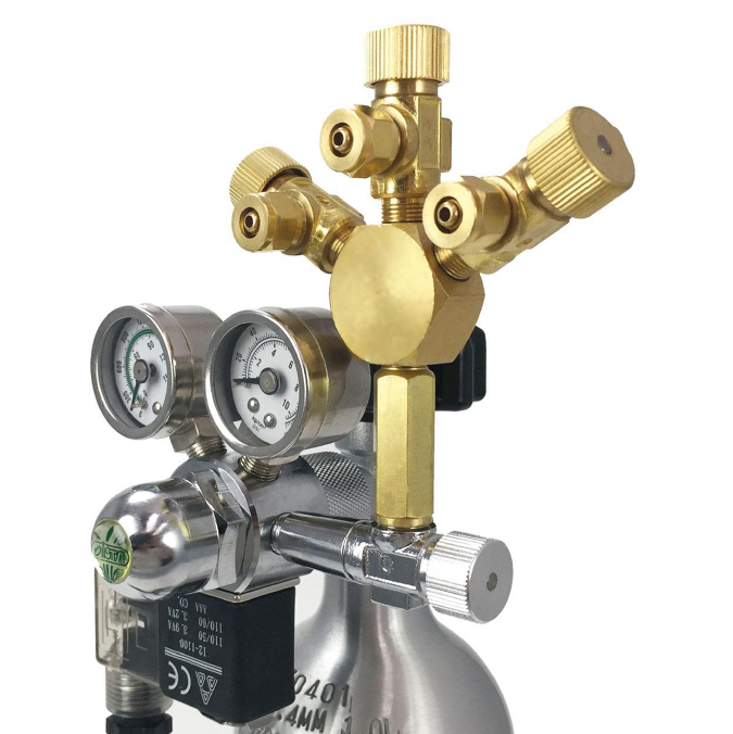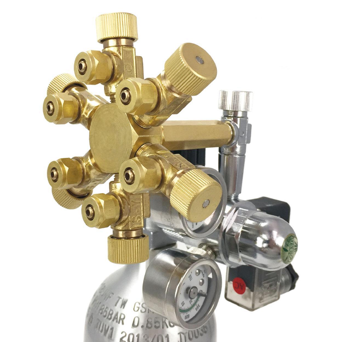 Los Divisores metálicos de CO2 ISTA Son ideales para las instalaciones profesionales, ya que ahorran espacio y dinero al emplear un solo cilindro con un único regulador para suministrar a varios sistemas.