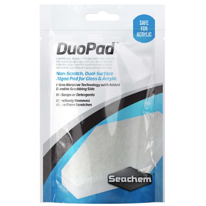 DuoPad es una almohadilla para algas de doble superficie sin arañazos para vidrio y acrílico. El lado de espuma de melamina utiliza tecnología micro abrasiva para eliminar fácilmente las algas de los lados de su acuario, mientras que el lado de lavado duradero le permite atacar las ranuras más ásperas de las rocas y la madera a la deriva. Es particularmente eficaz en la eliminación de algas y de los arañazos. Es químicamente inerte y no utiliza jabones ni detergentes. Su color blanco contrasta con las algas oscuras, lo que hace que sea más fácil ver cuando las áreas están completamente limpias.