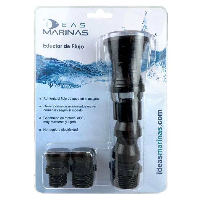 Estos dos flujos se suman y combinan dentro del eductor, incrementando hasta en un 400% el volumen de agua que mueve la salida de la bomba de retorno del acuario o cualquier bomba de circulación.