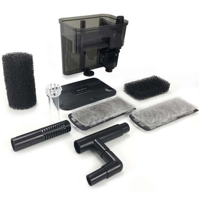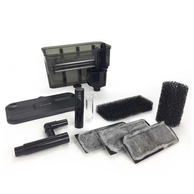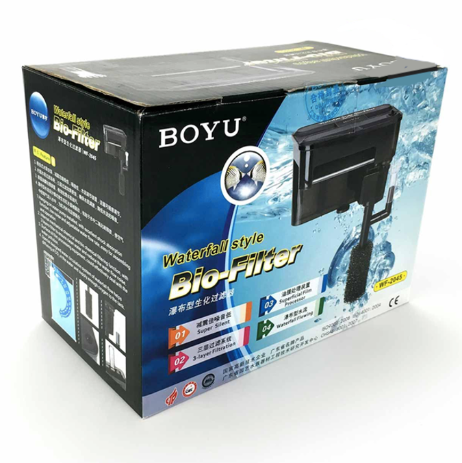 Los filtros BOYU de la serie WF 2035, 2045 y 2055 son una versión evolucionada de los filtros tipo mochila tradicionales. Están diseñados para obtener una calidad de agua excelente tanto en acuarios de agua dulce como salada, y abarcando desde los sistemas más pequeños hasta los que superan los 200 litros de capacidad. La primera de sus ventajas es su nuevo desnatador auto-ajustable, que aprovecha la aspiración de la bomba para absorber las molestas impurezas que flotan en el agua e impiden un correcto intercambio gaseoso en la superficie del agua. La segunda ventaja es la instalación de su bomba sumergida dentro del acuario y no adosada al cuerpo exterior del filtro. Esto facilita un purgado rápido y evita posibles accidentes o eventuales fugas de agua. Esta posición en la bomba además permite un diseño extrafino de su cuerpo, ahorrando mucho espacio en la cara del acuario donde se apoya el filtro. Una vez dentro, El agua es forzada a atravesar sus cartuchos filtrantes mecánicos y químicos de fácil extracción para llegar a una esponja que desempeñará la filtración biológica. Puede instalar el filtro en menos de un minuto y realizar un mantenimiento periódico fácilmente casi sin mojarse las manos. Cuenta con un pre-filtro de esponja en el área de aspiración para evitar que entren cuerpos demasiado grandes o aspirar accidentalmente ciertos organismos sensibles a las corrientes. Al tratarse de un sistema de filtración externo aporta muchas ventajas como la facilidad de uso y mantenimiento, así como el hecho de casi no ocupar espacio dentro del hábitat de nuestros peces. Las bombas que equipan estos filtros son altamente eficientes, ya que obtienen un flujo regulable de hasta 720 litros por hora con un consumo de 8.6w en el modelo más potente.