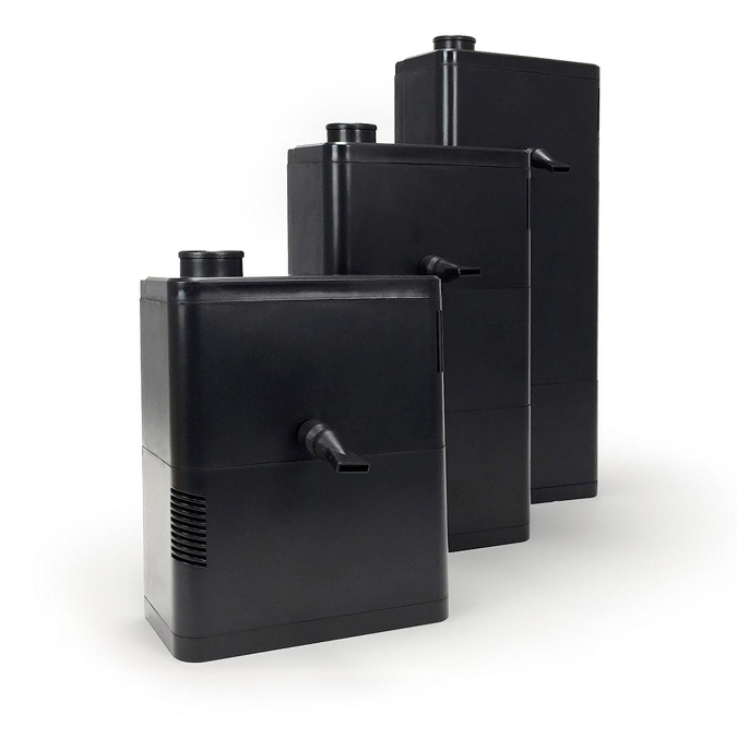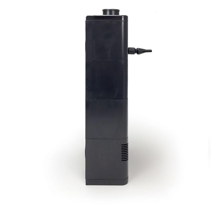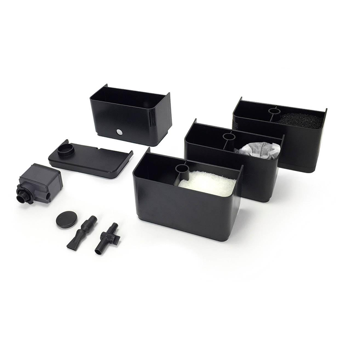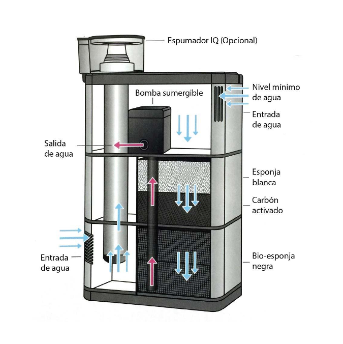 Según el modelo, contiene dos, tres o cuatro compartimientos modulables y desmontables, con materiales filtrantes químicos biológicos y mecánicos, una bomba sumergible integrada de 600 l/h (15w) y un compartimento para colocar un espumador de proteínas iQ opcional.