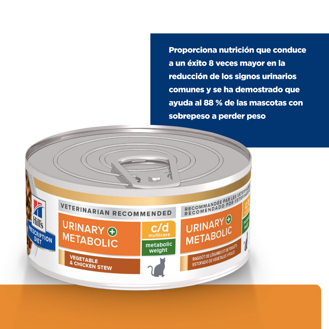 Prescription Diet c/d Multicare + Metabolic Weight, especialmente formulada para ayudar a manejar la salud urinaria y el peso de tu gato. Gracias a la ciencia, c/d Multicare + Metabolic Weight ofrece una nutrición clínicamente probada para reducir los signos urinarios más comunes en un 89% y reducir el peso corporal en un 11% en 60 días. Este alimento húmedo saludable para gato apoya la salud urinaria mientras proporciona toda la nutrición que tu felino necesita durante la pérdida y el mantenimiento del peso.