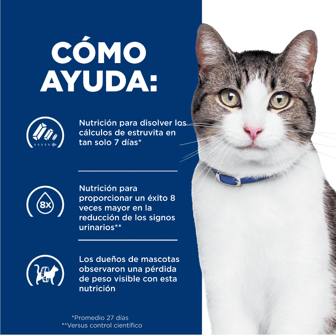 - Nutrición clínica especialmente formulada para manejar la salud urinaria y el peso de tu gato.