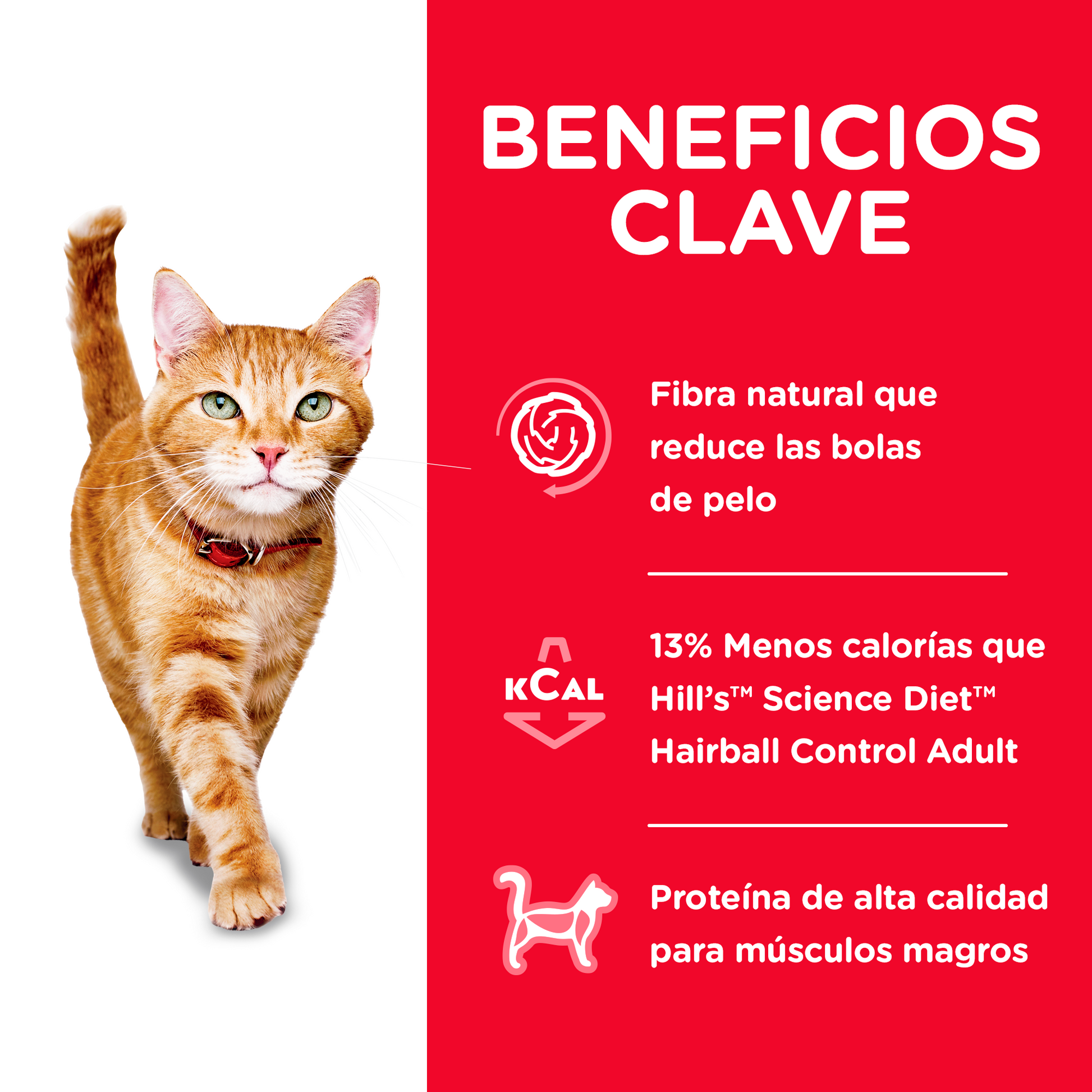 - 13% menos calorías vs. Hill's Science Diet Adult Hairball Control.