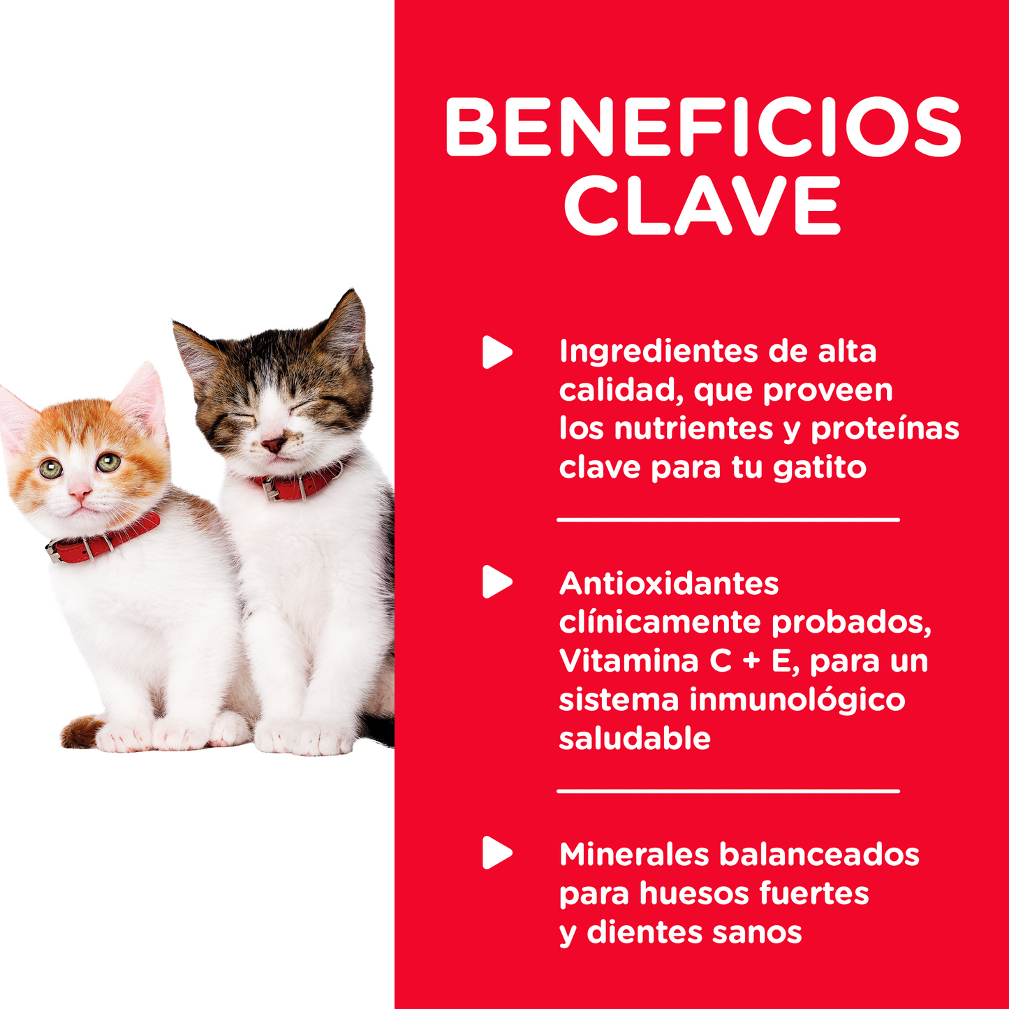 - Ingredientes de alta calidad que aseguran la disponibilidad de nutrientes clave y proteínas para tu gatito.