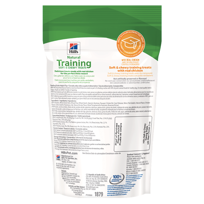 Hill's Natural Training Soft and Chewy Treats premios de entrenamiento para perros son la opción ideal para motivar y recompensar a tu mascota durante las sesiones de entrenamiento. Estos premios de entrenamiento para perro están hechos con pollo verdadero como el ingrediente #1, asegurando una recompensa sabrosa y de alta calidad. Su textura suave y masticable los hace perfectos para perros de todas las edades y tamaños. Sin conservadores ni saborizantes artificiales, estos treats son tan saludables como deliciosos. Gracias a la ciencia y al compromiso de Hill's con la nutrición de las mascotas, puedes confiar en la calidad de cada premio. Hill's Science Diet es la marca de alimento para perro más recomendada por veterinarios en EUA, con 100% de satisfacción garantizada o te devolvemos tu dinero.