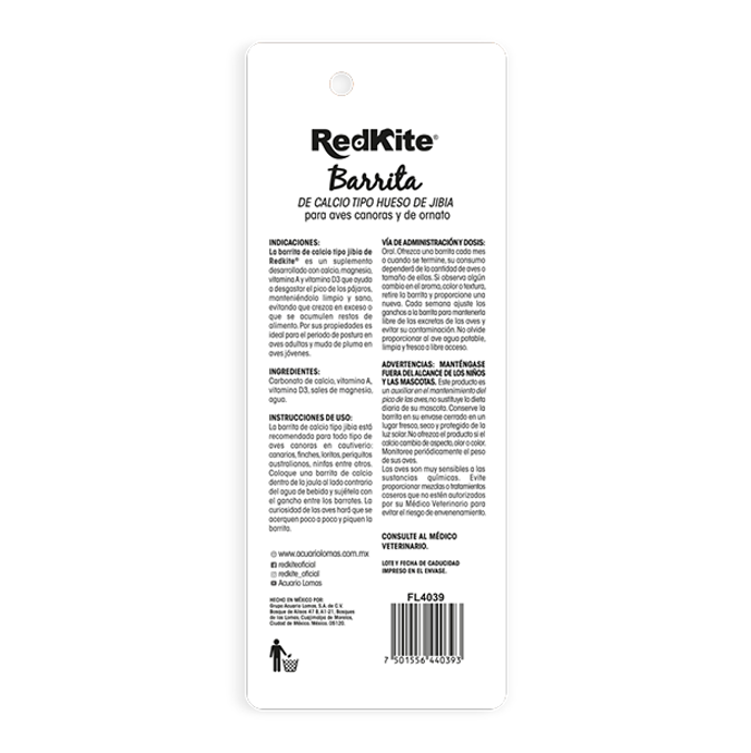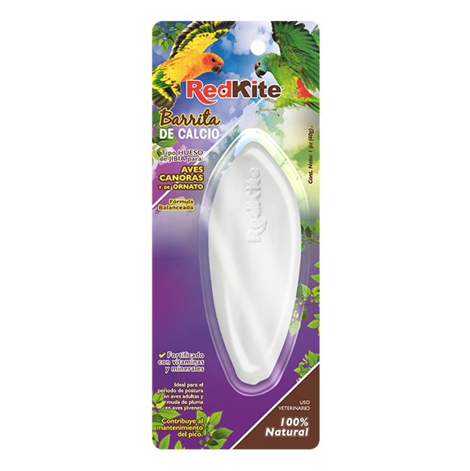La barrita de calcio tipo hueso de jibia de Redkite es un auxiliar adecuado para el desgaste del pico de las aves de ornato, con su fórmula balanceada aporta nutrientes importantes como la vitamina A y D3, así como el magnesio, promoviendo la salud en huesos, plumas, cascarones. Por sus nutrientes es ideal para el periodo de postura en aves adultas y muda de pluma en aves jóvenes.