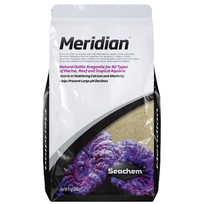 Meridian es un sustrato de aragonita oolítico totalmente natural (esférico o en forma de huevo) para todos los acuarios de arrecife y marinos. Meridian es el sustrato de aragonita premium para los acuarios de arrecife. Su tamaño de grano (un tamaño de grano bastante uniforme de 0.25 a 0.50 mm) es ideal para los habitantes de los arrecifes y su composición química ayudará a estabilizar el calcio y la alcalinidad al tiempo que previene grandes disminuciones de pH. A diferencia de los productos "húmedos" de la competencia comercializados bajo el pretexto de ser "vivos", Meridian se vende seco, por lo que solo paga por grava y no por agua innecesaria. Estos productos implican que contienen animales vivos y microscópicos cuando en realidad solo contienen bacterias comunes. Seco o húmedo, hay bacterias en cada sustrato disponible. Si uno se preocupa por acortar el tiempo del ciclo del acuario para un nuevo sistema, entonces el uso de un producto diseñado para ese propósito en particular sería más apropiado (como Stability de Seachem)