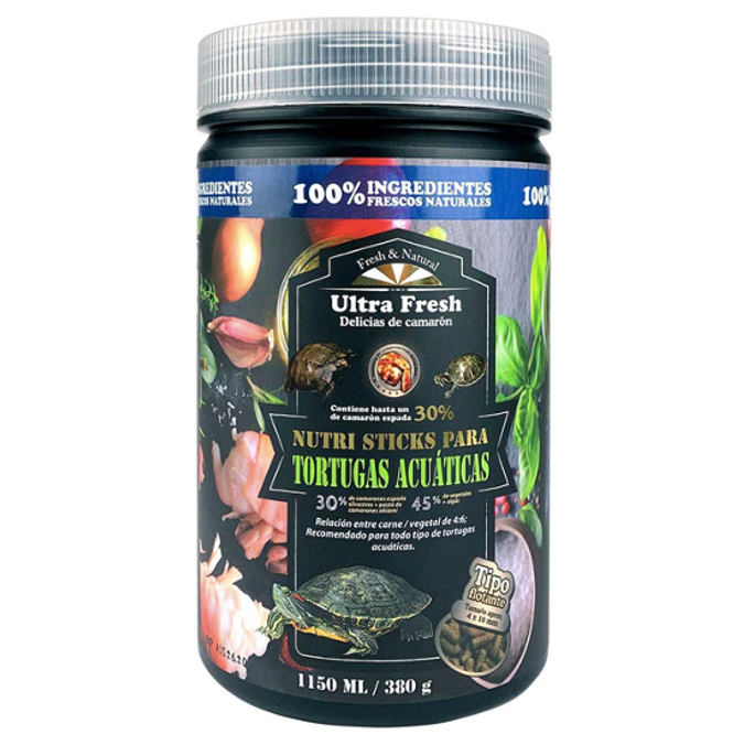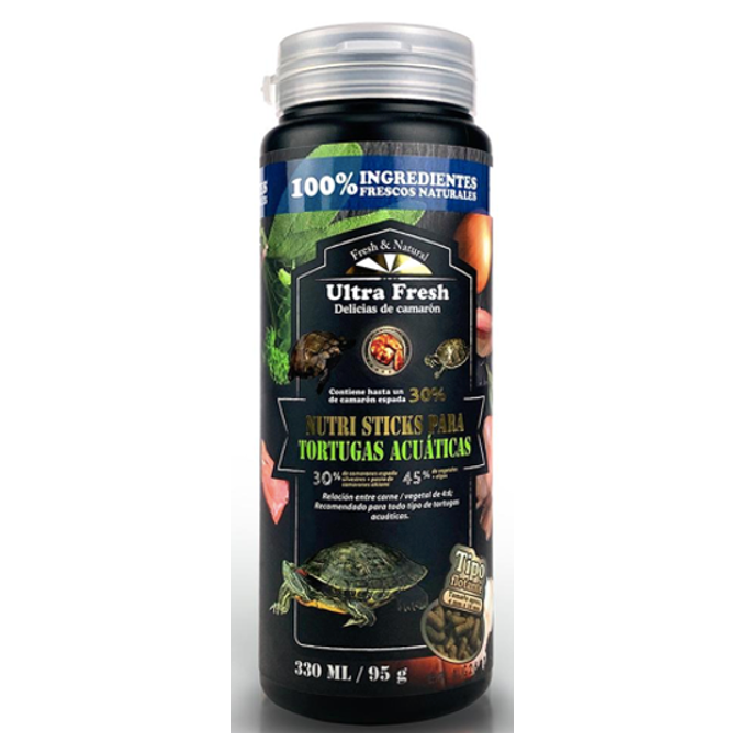 Azoo Plus Ultra Fresh Nutri sticks para tortugas acuáticas es un alimento a base de grandes pellets recomendado para todo tipo de tortugas acuáticas. Para elaborar este producto utilizamos únicamente productos frescos 100% naturales, sin aditivos químicos y cuidadosamente seleccionados. Entre estos ingredientes, añadimos hasta un 30% de camarones espada frescos de calidad premium procedentes de Yilan, en Taiwán, que aportan una palatabilidad natural que estimula el apetito de los peces. Este alimento balanceado incrementa la eficiencia digestiva y una rápida ingesta para reducir la contaminación del agua en el acuario. Este producto facilita lograr una coloración natural y profusa, con unas altas tasas de crecimiento y de éxito en la reproducción de este tipo de reptiles.