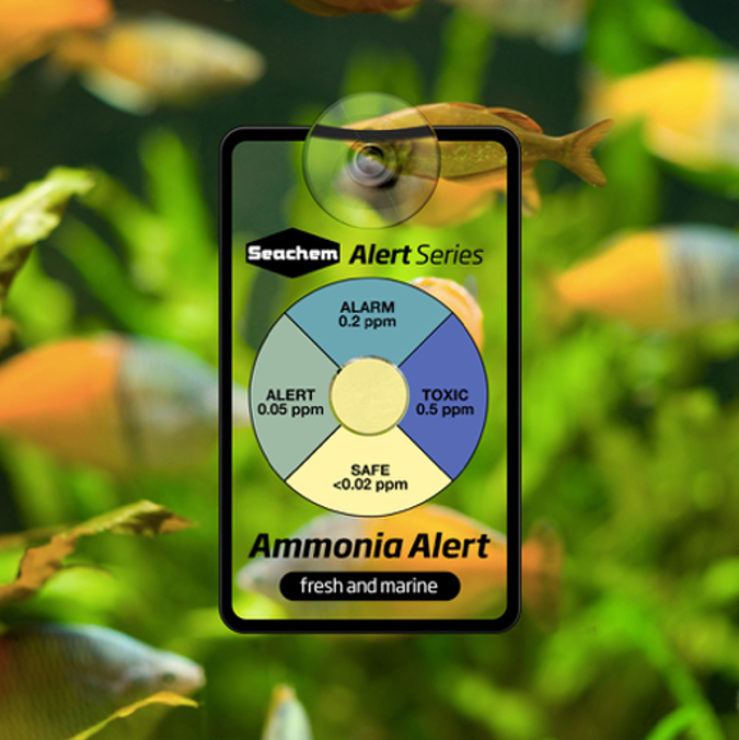 El sensor de Ammonia Alert cambia reversiblemente de amarillo a verde a azul, en relación con la concentración de amoníaco. Detecta menos de 0.05 mg / L (ppm) de amoníaco libre y le alerta sobre el asesino # 1 antes de cualquier signo de estrés. La presencia del amoníaco libre es detectable de forma continua con un tiempo de respuesta de unos 15 minutos. La respuesta a la disminución del amoníaco es más lenta, requiriendo aproximadamente 4 horas para pasar de TÓXICO a SEGURO en la eliminación de amoníaco. Uso marino o de agua dulce.