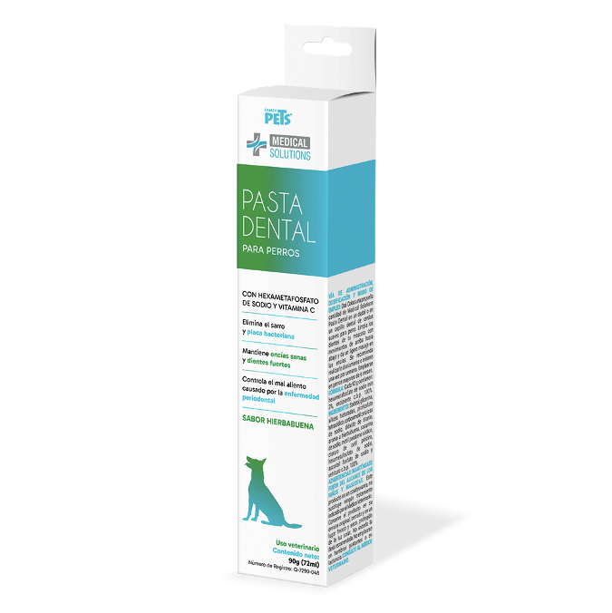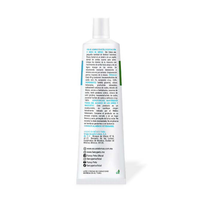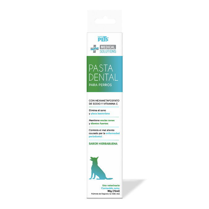 La pasta dental para perros de Medical Solutions es una fórmula desarrollada con hexametafosfato de sodio que previene la formación de placa bacteriana, controla el mal aliento causado por la acumulación de bacterias, elimina el sarro manteniendo las encías y dientes fuertes y sanos. Además contienen vitamina C que ayuda con la recuperación de encias tras un proceso inflamatorio causado por la gingivitis o periodontitis. Es recomendable combinar el uso de este producto con el refrescante de aliento Fancy Pets complementando con la visita regular del Médico Veterinario para obtener una óptima salud oral. La pasta dental Medical Solutions no debe emplearse en perros menores a 6 meses de edad, y hembras gestantes o en lactancia.