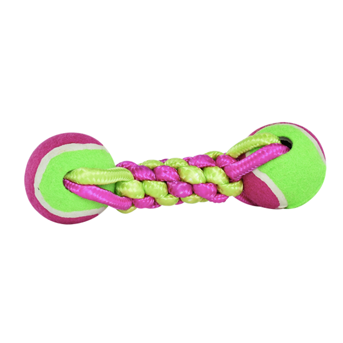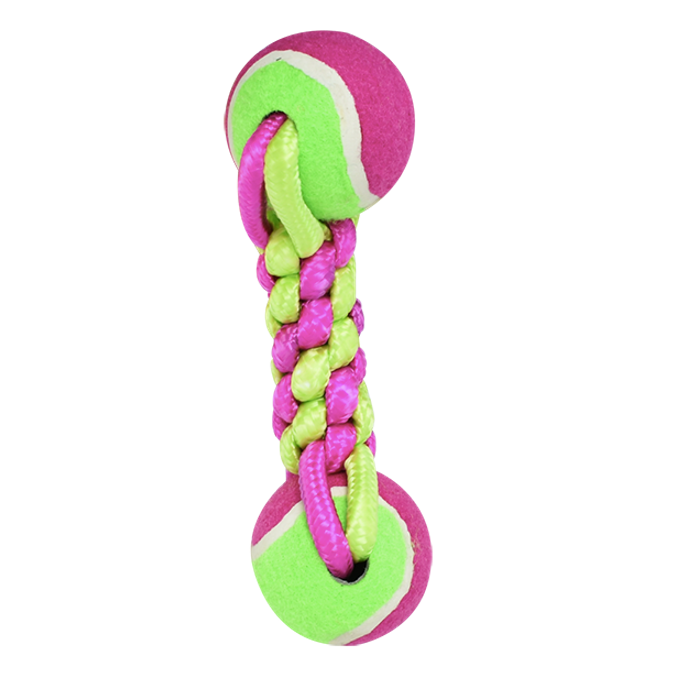 Pesa de hilo de algodón multicolor, con trenzado en la parte del medio y pelotas tipo tenis en los extremos. Fabricado de algodón que ejercita la mandíbula, fortalece las encías, limpia los dientes y entretiene a la mascota. Le permite interactuar con el perro, previniendo el estrés y el problema de mordisquear.