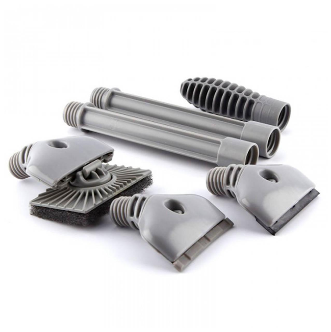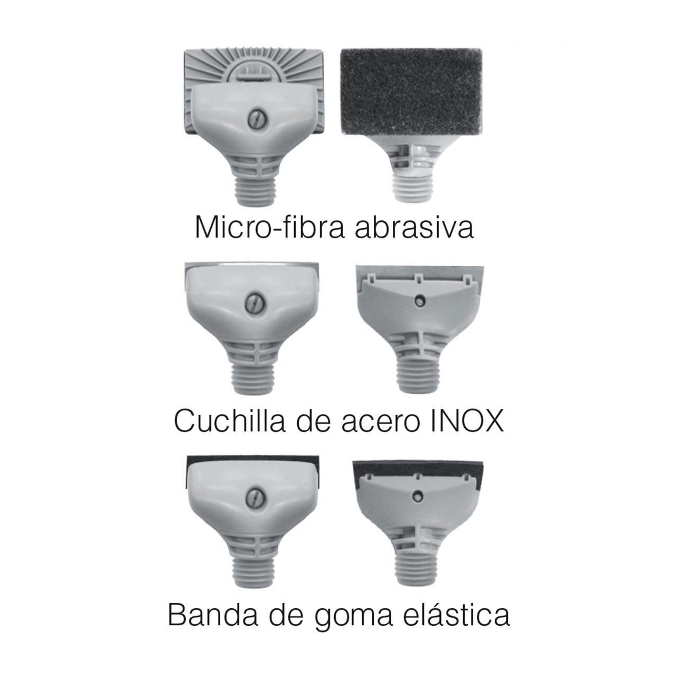 Es excelente para limpiar las algas sin riesgo de producir ralladuras, ya que incluye el cabezal adecuado para cada situación: una rasqueta de goma para eliminar las algas sin rayar vidrio o acrílico, una esponja basculante de 90° para retirar las algas de las paredes de vidrio y una cuchilla de acero para eliminar las algas más resistentes en acuarios de vidrio.