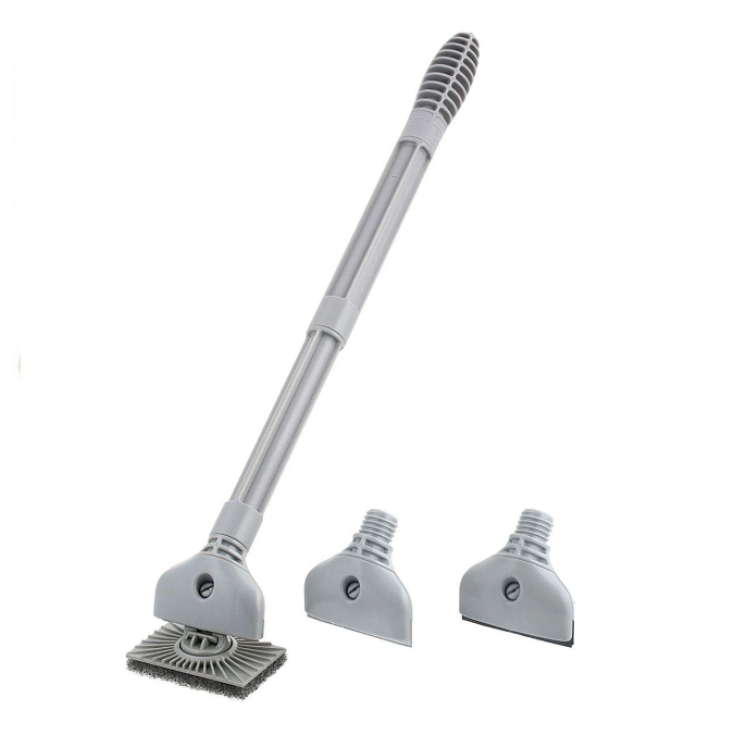 Incluye tres cabezales intercambiables para eliminar las algas y las incrustaciones de las paredes de su acuario, adaptándose a cualquier superficie y alcanzando cualquier lugar gracias a su mango modular desmontable y flotante.