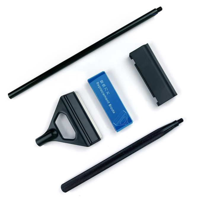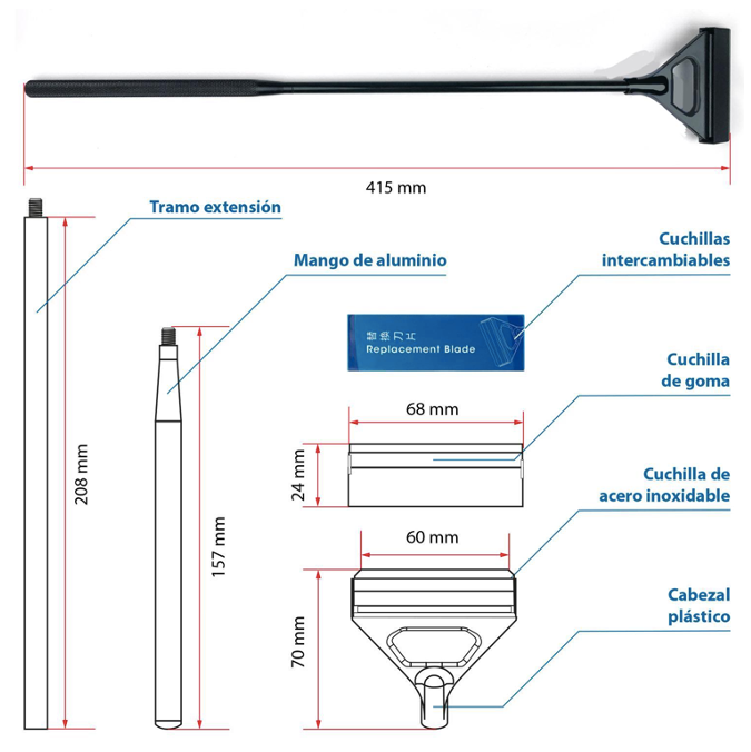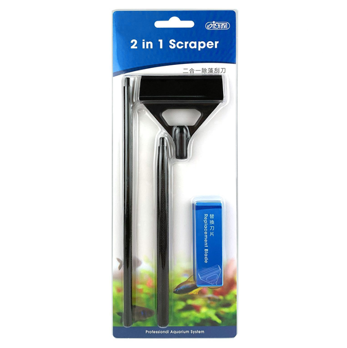 Rasqueta profesional de doble función especialmente diseñada para acuarios de pequeño y mediano tamaño. Esta rasqueta reúne en un sólo cabezal una cuchilla extraíble e intercambiable de acero inoxidable y una banda de goma, que cumple además la función de proteger la cuchilla cuando no usemos la rasqueta.