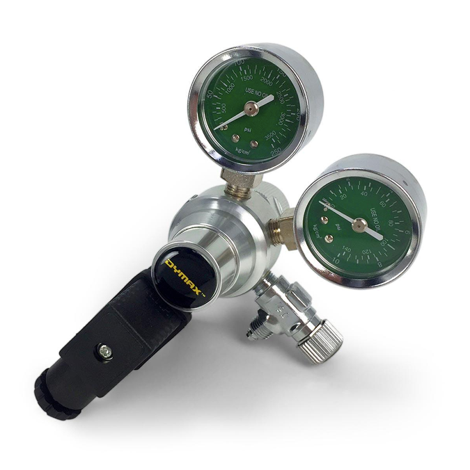 El Regulador profesional de CO2 Dymax Incluye electro-válvula de 10 w a 110V y dos manómetros con escala de Kg/cm2 y psi; un manómetro de alta presión (0-250 Kg/cm2) y un manómetro de baja presión (0-10 Kg/cm2). Este regulador es de tipo aguja con reductor de presión automático.