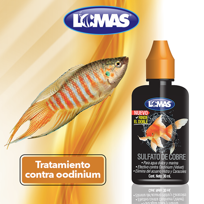 Tratamiento efectivo contra oodimium (velvet). El Oodinium afecta tanto a peces de agua dulce como salada, está causada por la presencia de un parásito dinoflagelado denominado Oodinium ocellatum, Suinfestación es apreciable por la aparición de pequeños puntos blancos no superiores al 0,1 mm de diámetro causando una apariencia aterciopelada en los animales. Elimina del acuario hidra y caracoles.
