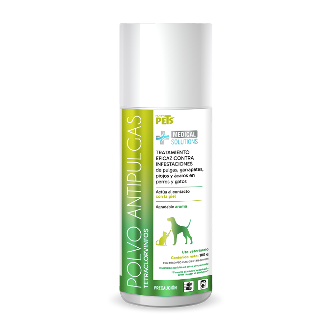 Talco antipulgas para perros y gatos Medical Solutions es un parasiticida de uso externo, recomendado para el control y tratamiento de infestaciones por pulgas (Ctenocephalides canis, C. felis), garrapatas (Dermacentor spp, Rhipicephalus spp), piojos (Trichodectes canis, Felicola subrostratus), ácaros (Sarcoptes scabiei, Dermanyssus gallinae), en perros y gatos. Actúa al contacto con la piel por su rápida acción.