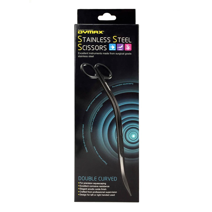 Tijeras de doble curva Dymax en acero inoxidable de grado quirúrgico anodizado en negro.