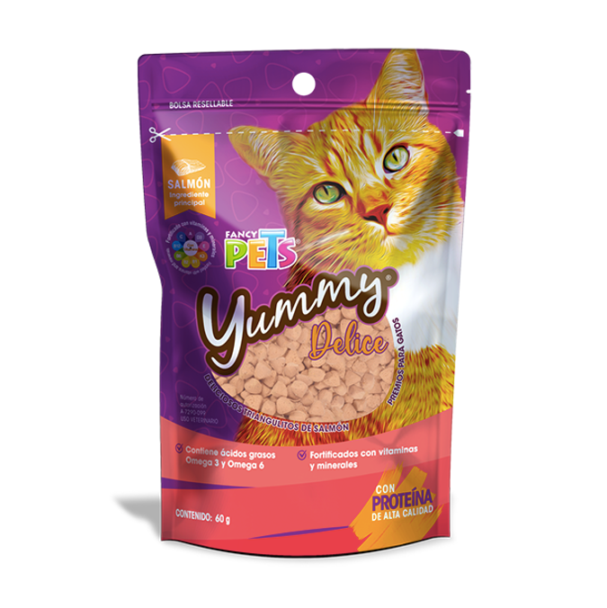 Los deliciosos triangulitos Yummy Delice son la opción saludable y nutritiva para consentir a tu gato. Formulados con ingredientes de la mejor calidad: harina de salmón alta en proteína (fácil de digerir, contiene los 11 aminoácidos esenciales para los gatos), aceite de salmón (rico en ácidos grasos Omega 6 y Omega 3, como DHA y EPA) y suplemento de vitaminas y minerales.